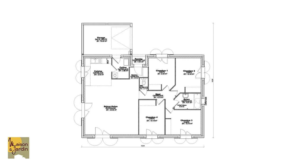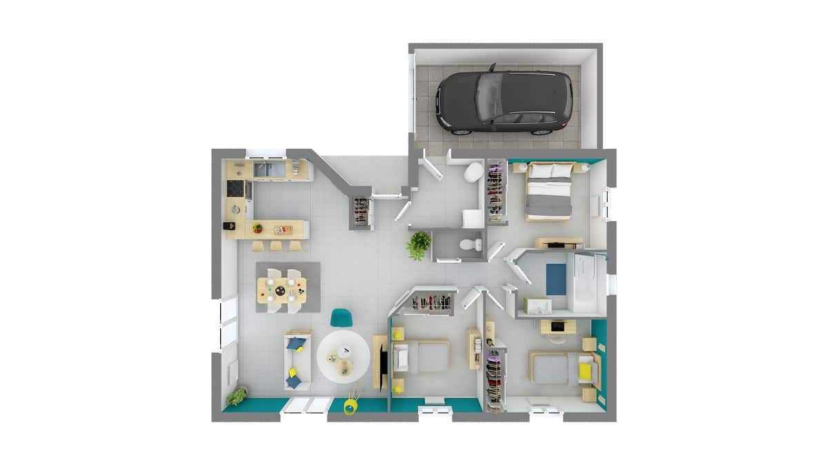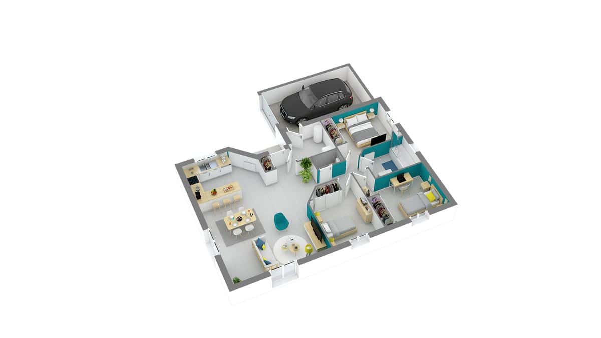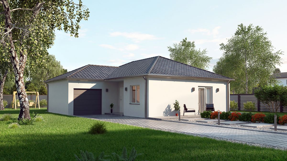 Maison modulable, très fonctionnelle avec ou sans garage, la Lucia séduit avec sa toiture 4 ou 6 versants et sa forme en L