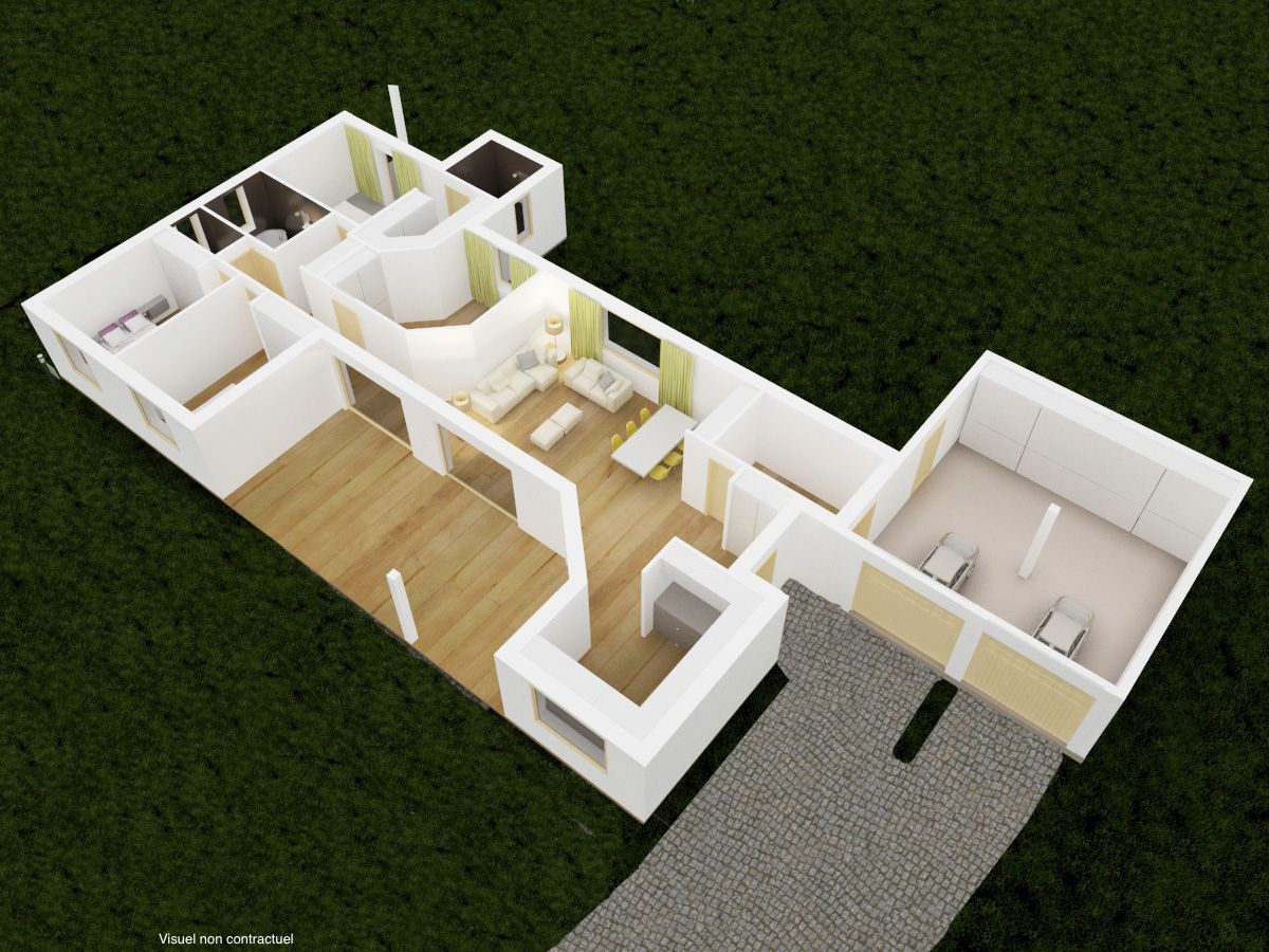 Outre son design, cette maison se caractérise par son grand confort. Basse consommation, elle vous offre en plus des volets roulants electriques, 2 terrasses couvertes, et un plan en étoile délimitant parfaitement les différents lieux de vie.
