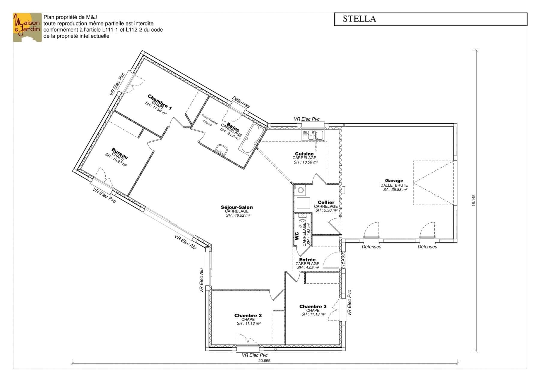 Proposée dans une version spacieuse de 121m2 plus un immense garage de 36m2, la Stella offre une toiture 4 pans et des volets roulants électriques.