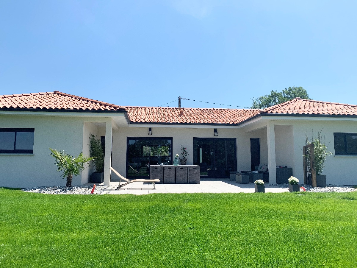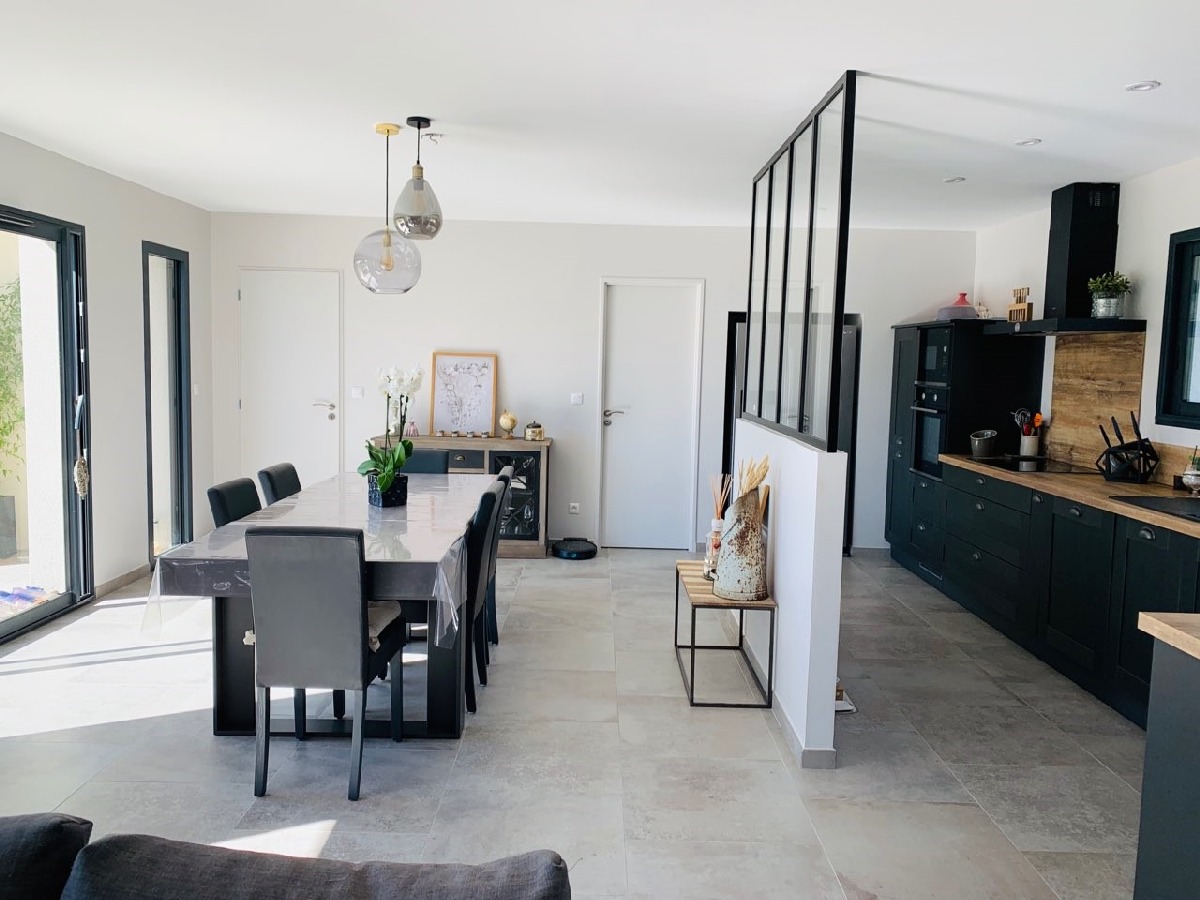 Cette superbe maison en H, de plain-pied, située à proximité du Puy-en-Velay en Auvergne, ne peut que séduire. Son apparence luxueuse et ses nombreux atouts la font aimer immédiatement. Un extérieur soigné, doté d’une grande terrasse latéralement dotée de porches couverts. Un toit multi pentes agrémenté de descentes d’eau pluviale en aluminium. Un intérieur lumineux, avec une pièce à vivre bien servie par les grandes portes-fenêtres. La cuisine, séparée par un mur translucide à mi-hauteur, est isolée tout en profitant elle aussi de la lumière.